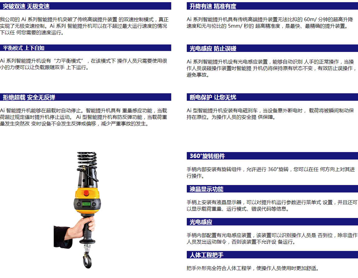 Ai 智能提升机能够在超载时自动停止。智能提升机具有 重量感应功能,当载荷超过规定值时提升机停止运动。 Ai 型智能提升机有防反弹功能,当载荷重量发生突然改 变时设备不会发生反弹或偏移,减少严重事故的发生。