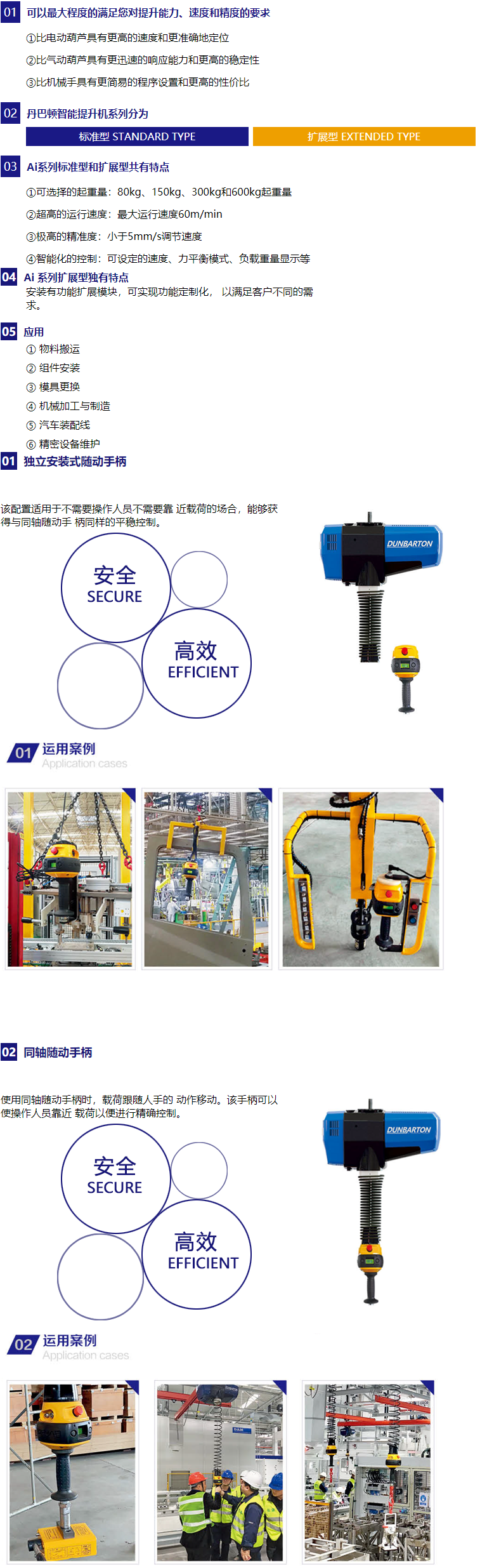 Ai 系列智能提升机设有“力平衡模式”,在该模式下 操作人员只需要使用很小的力便可以让负载跟随双手 上下运行。